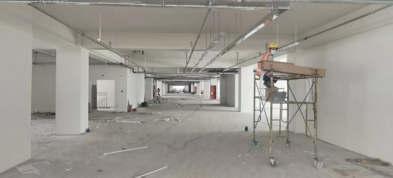 在地下停車場改造施工現(xiàn)場,與上月份相比,工程已經(jīng)初見雛形,工人們有的在忙著吊頂,有的在進(jìn)行綜合橋架施工。據(jù)汪經(jīng)理介紹,“工程主要包括消防管道、噴淋管道、火災(zāi)報警器、空調(diào)系統(tǒng)和照明的安裝等。智能化工程包括智慧停車和反向?qū)ぼ嚒V播、門禁等。”安裝工程、智能化工程這二項工程在穿插進(jìn)行中,預(yù)計到9月底,準(zhǔn)備各類設(shè)備調(diào)試工作。