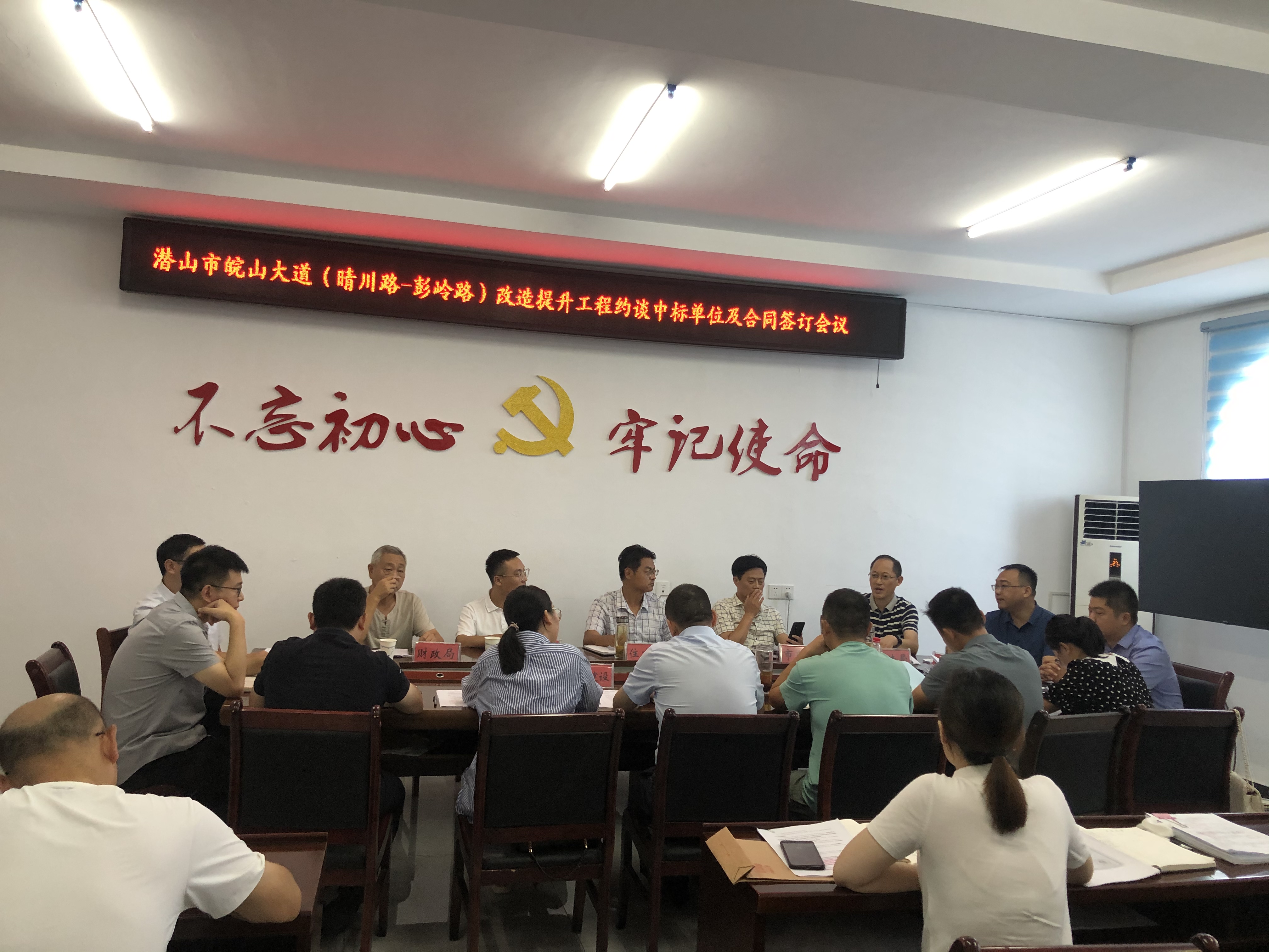 8月15日,總經(jīng)理朱仲建攜公司商務(wù)部、造價部一行赴潛山參加皖山大道(晴川路—彭林嶺路)改造提升工程合同簽訂會議,分別與交投公司、重點工程中心、監(jiān)理等單位代表簽訂合同。