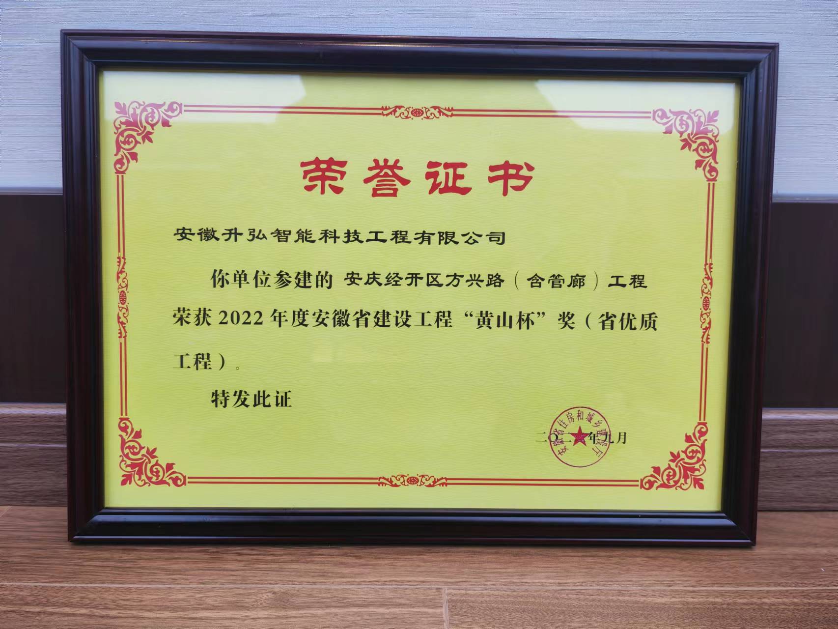 近日,集團公司子公司安徽升弘智能科技工程有限公司參建的安慶市經(jīng)開區(qū)方興路(含管廊)工程榮獲2022年度安徽省建設工程“黃山杯”獎(省優(yōu)質工程)。