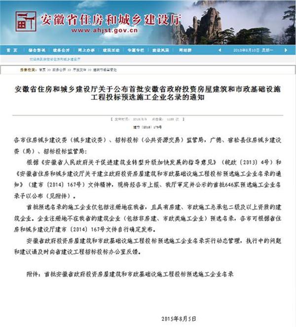 日前,安徽省住房和城鄉建設廳公布了首批安徽省政府投資房屋建筑和市政基礎設施工程投標預選施工企業名錄,我公司名列其中。