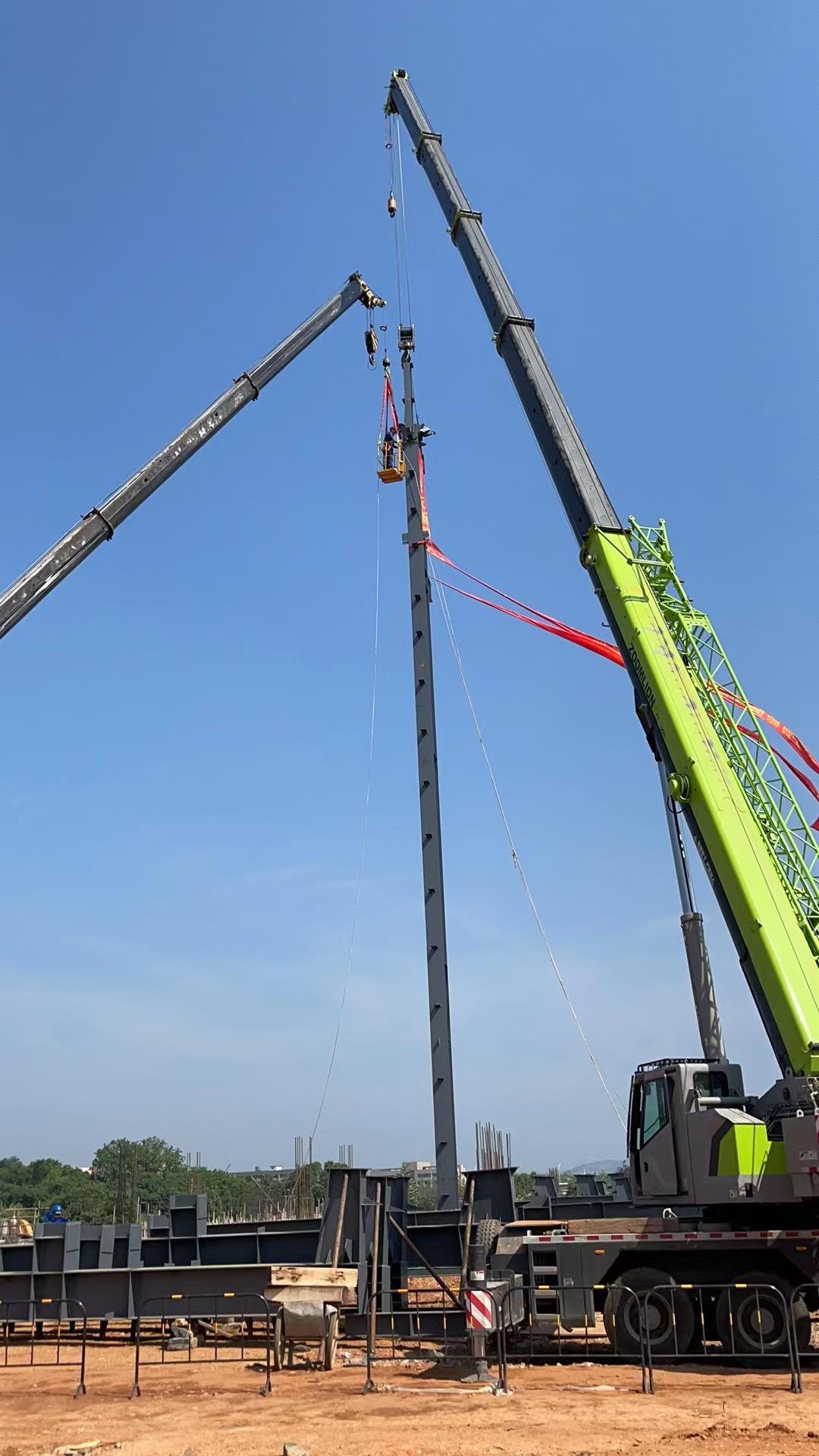 今日正值入伏,工地烈日炎炎,高溫炙熱,現場大型機械正在緊張的施工中。“向右30度,向前2.5米,好,下,下,慢一點”……隨著施工現場吊裝指揮的命令發出,一臺360T的履帶吊緩緩地將一根長25米、柱截面H680*440*10*18的鋼柱,重量6.5噸的鋼柱緩緩提起,精準入位完成吊裝。